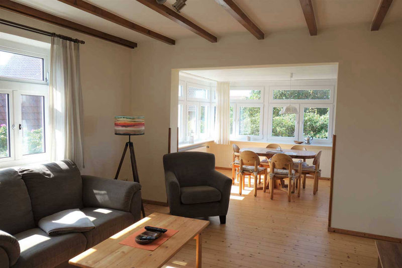 Unsere Wohnung 1 liegt im Erdgeschoss und ist mit einer Wohnfläche von 61qm für bis zu 4 Personen ausgelegt. Die Wohnung verfügt über ein Schlafzimmer mit Doppelbett und einem großen Kleiderschrank, sowie ein Schlafzimmer mit Etagenbett, ein gemütliches Wohnzimmer (TV Flachbildschirm), eine separate, voll eingerichtete Küche (u.a.Geschirrspüler,Mikrowelle,Ceranfeld) und ein Badezimmer. Das besondere Highlight dieser Wohnung ist die große Sonnenveranda, die zum Entspannen einlädt. Des Weiteren kann aus den Fenstern ein Blick auf die Baltrumer Dünen und teilweise auf das Wattenmeer genossen werden. Ein Kaminofen sorgt auch an kalten Tagen für gemütliche Stimmung.