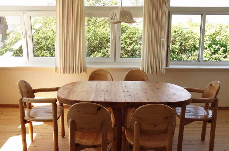Genießen Sie Ihr Frühstück an einem großen Esstisch in der Sonnenveranda unseres Hauses mit Blick über die herrlichen Dünen von Baltrum.
